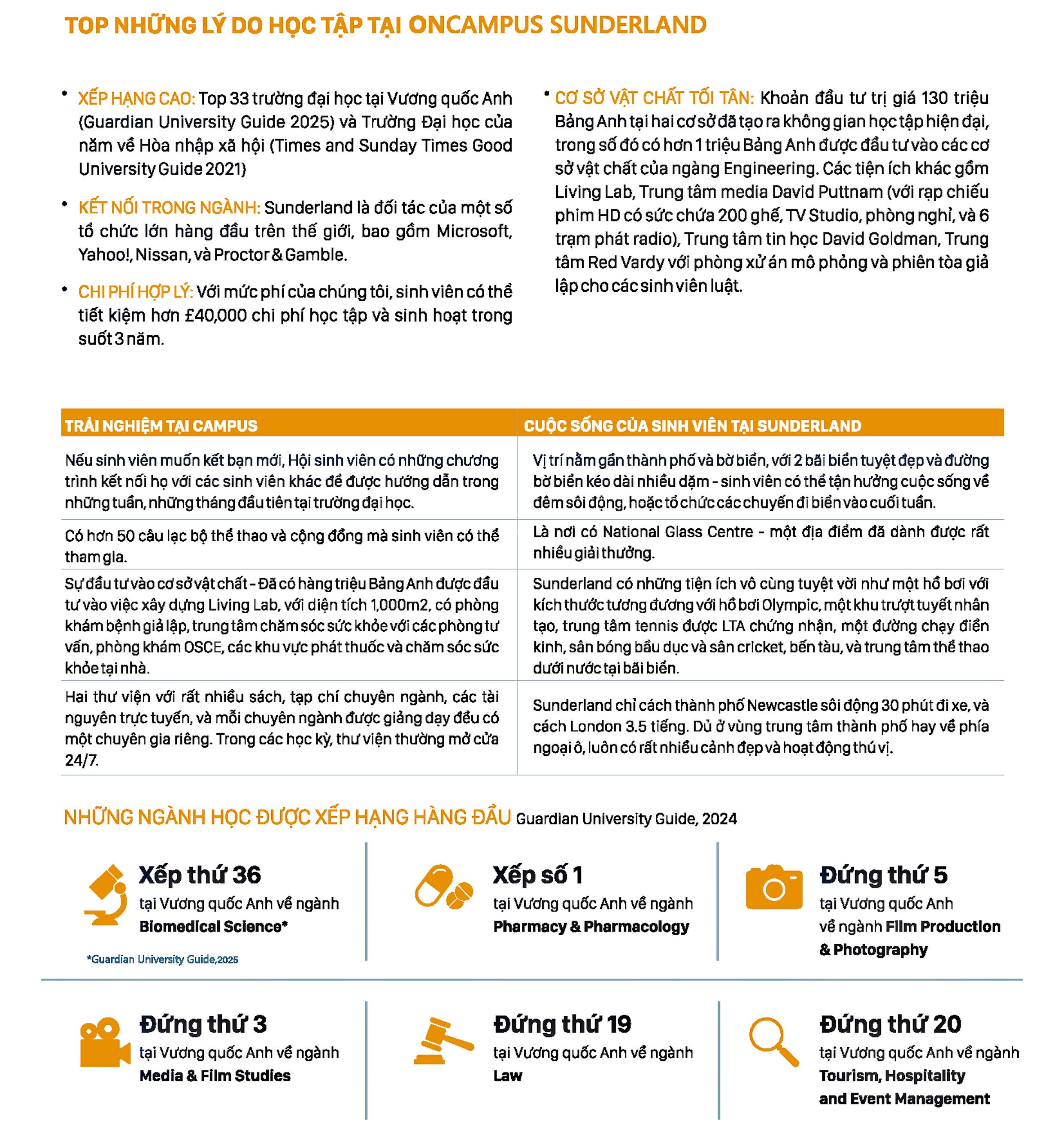 Tọa lạc trong khuôn viên của Đại học Sunderland, ONCAMPUS Sunderland cung cấp các chương trình Dự bị cho nhiều cấp độ Đại học và Sau đại học. Sinh viên được đảm bảo chuyển tiếp vào Đại học Sunderland sau khi hoàn thành thành công các khóa học.