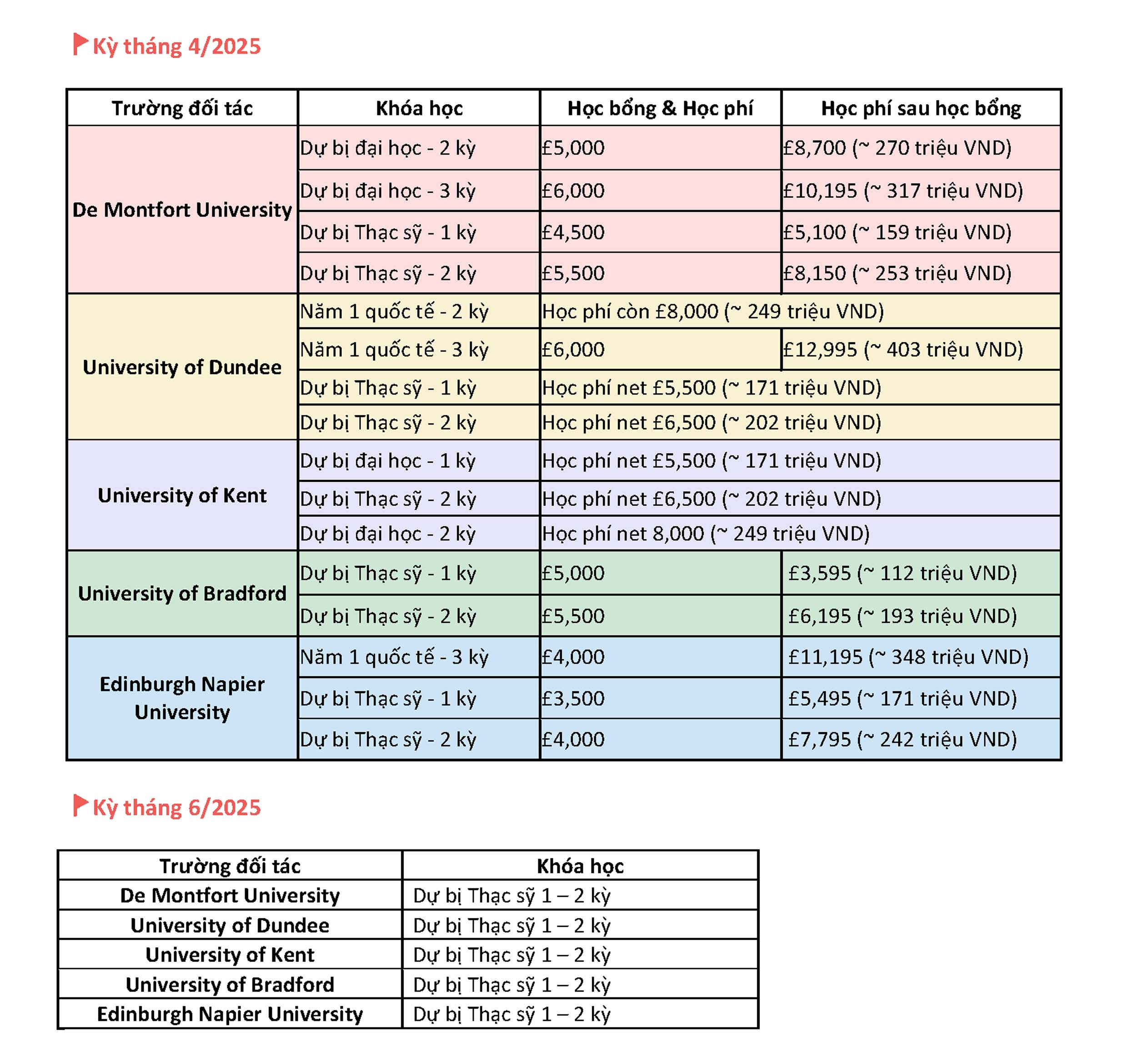 - Học Bổng up to 500GBP cho khóa dự bị Thạc Sỹ, Học Bổng Thạc Sỹ phụ thuộc vào chính sách của trường ĐH.