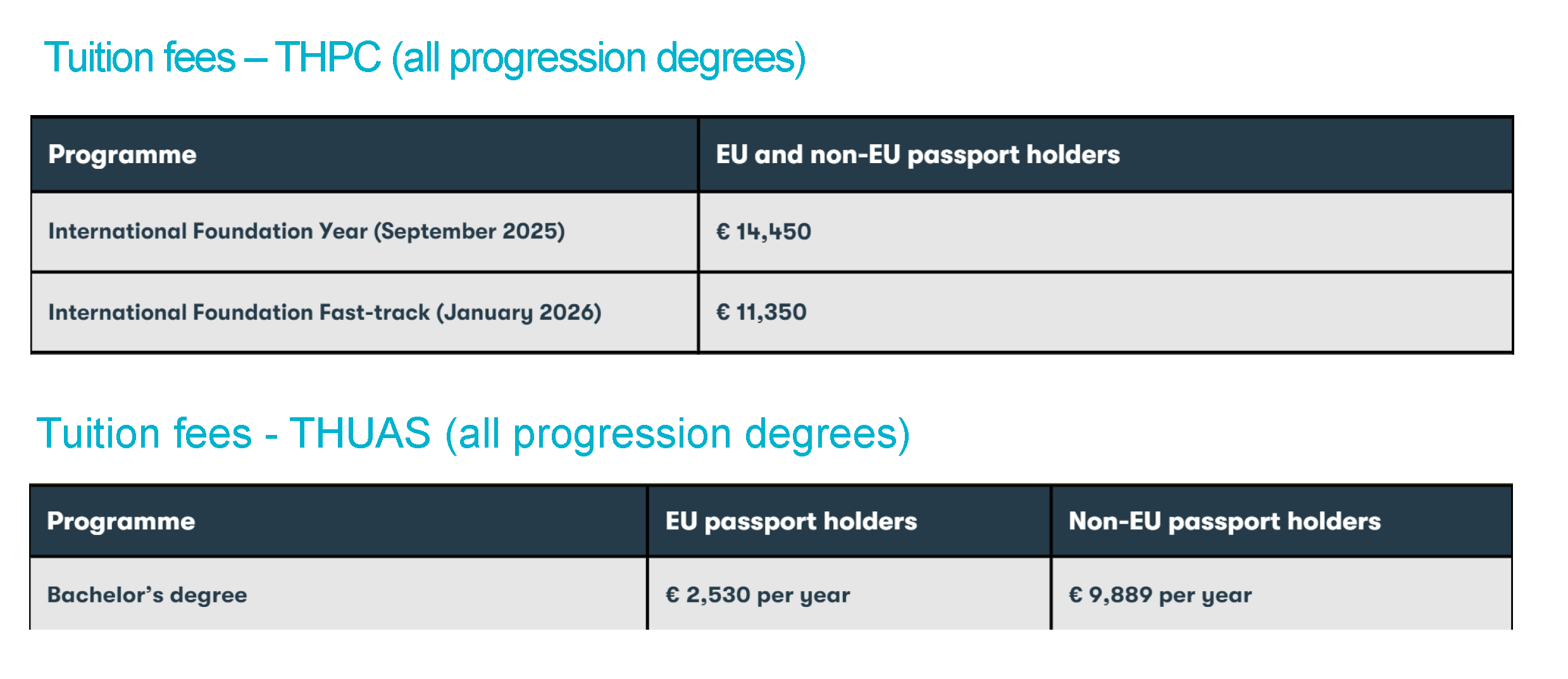 - Chương trình Dự bị Quốc tế: €13,930 mỗi năm