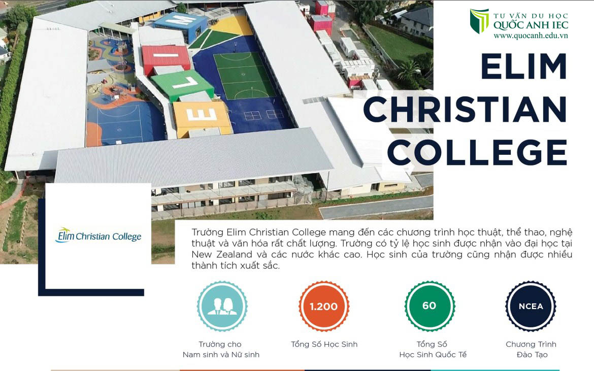 - Trường Elim Christian School mang đến các chương trình học thuật, thể thao, nghệ thuật và văn hóa rất chất lượng cho học sinh. Trường có tỷ lệ học sinh được nhận vào đại học tại New Zealand và các nước khác cao. Chúng tôi có các cơ sở đặt tại trung tâm Auckland (cơ sở Mt Albert) và đông Auckland (cơ sở Botany và cơ sở Golflands).