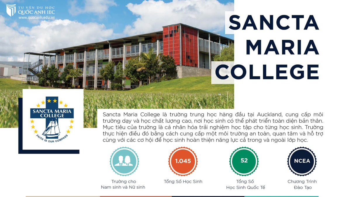 - Sancta Maria College là trường trung học hàng đầu tại Auckland, cung cấp môi trường dạy và học chất lượng cao, nơi học sinh có thể phát triển toàn diện bản thân. Mục tiêu của trường là cá nhân hóa trải nghiệm học tập cho từng học sinh, qua đó cho phép học sinh được phát triển toàn diện.