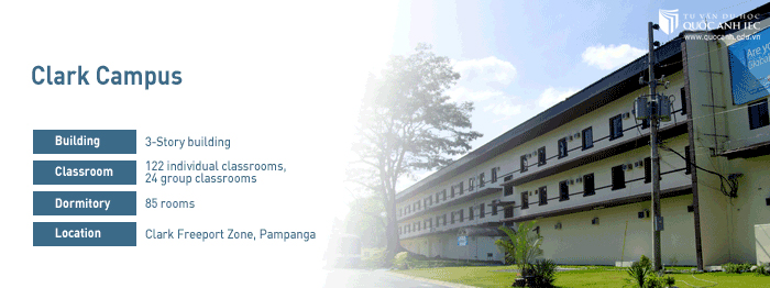 - Học xá Clark nằm ở vị trí chiến lược trong khu căn cứ quân sự cũ của quân đôi Mỹ trực thuộc thành phố Clark với cảnh quan và khí hậu giống với nước Mỹ. Chỉ mất 5 phút từ sân bay quốc tế Clark và 1,5 -4 giờ bay từ các Quốc gia lớn ở châu Á. Clark cũng tự hào vì có một loạt các hoạt động giải trí và kinh doanh, yếu tố giúp nó trở nên hoàn hảo trong việc cung cấp chất lượng giảng dạy hàng đầu chúng tôi muốn mang đến cho học viên của chúng tôi.