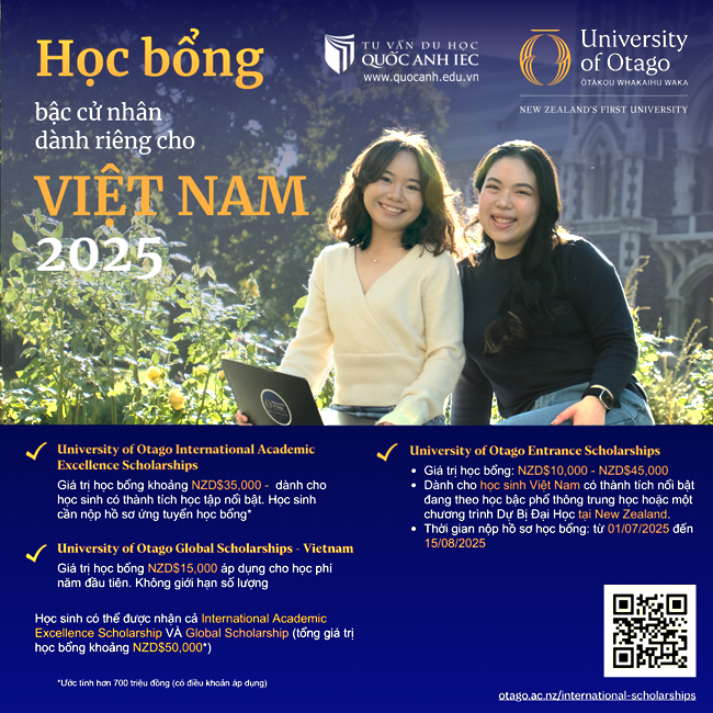 HỌC BỔNG NEW ZEALAND TRỊ GIÁ 700 TRIỆU ĐẾN TỪ ĐẠI HỌC OTAGO – DÀNH RIÊNG CHO SINH VIÊN VIỆT NAM