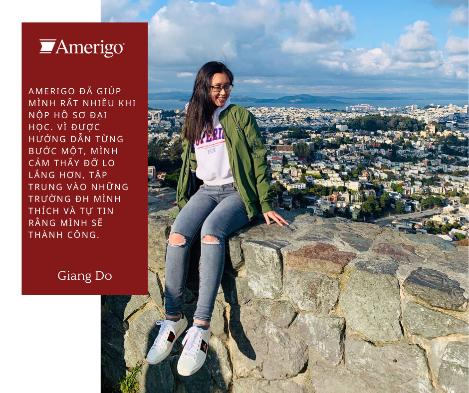 “Amerigo đã giúp mình rất nhiều trong quá trính ứng tuyển Đại học, bắt đầu từ năm lớp 11," Giang chia sẻ. “Mình được sử dụng các công cụ và công nghệ mới nhất hiện nay, ví dụ như được học gia sư trực tuyến và làm bài thi thử SAT hàng tuần. Cô Adriana Fernandez là giáo viên hướng dẫn Đại học của mình và cô đã giúp mình nghiên cứu về hệ thống trường Đại học ở Mỹ, tìm hiểu xem mỗi trường có yêu cầu như thế nào để được nhận học.”