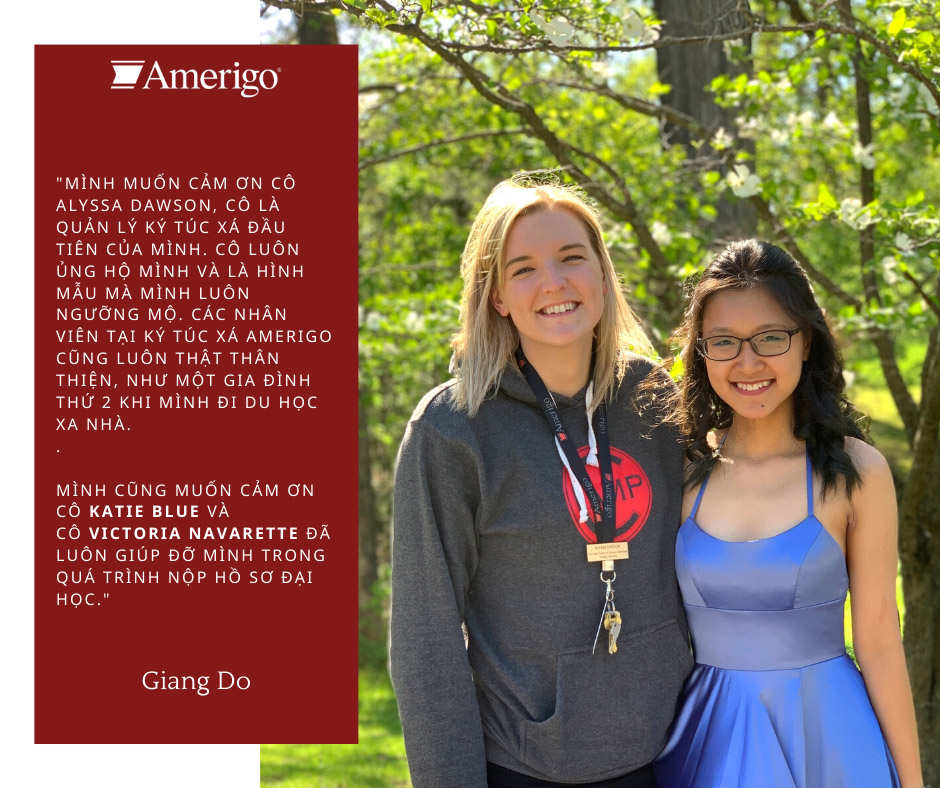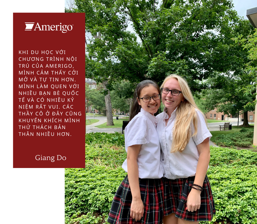 Giang đã tham gia chương trình nội trú của Amerigo từ năm 2017. Thật khác với cô bé ít nói khi mới sang Mỹ, giờ đây Giang là một trong những thành viên tích cực nhất trong cộng đồng học sinh quốc tế ở Amerigo và đạt thành tích xuất sắc cả trong học tập và hoạt động ngoại khoá.