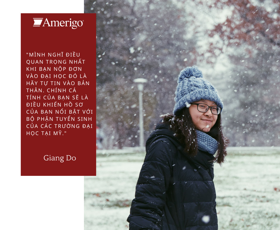 Với hồ sơ vô cùng ấn tượng như vậy, Giang chia sẻ bạn vẫn dành nhiều thời gian chuẩn bị rất kỹ lưỡng khi nộp hồ sơ ứng tuyển Đại học tại Mỹ. Các thầy cô hướng dẫn tại Amerigo đã bắt đầu làm việc với Giang để xây dựng hồ sơ ngay từ năm lớp 11.