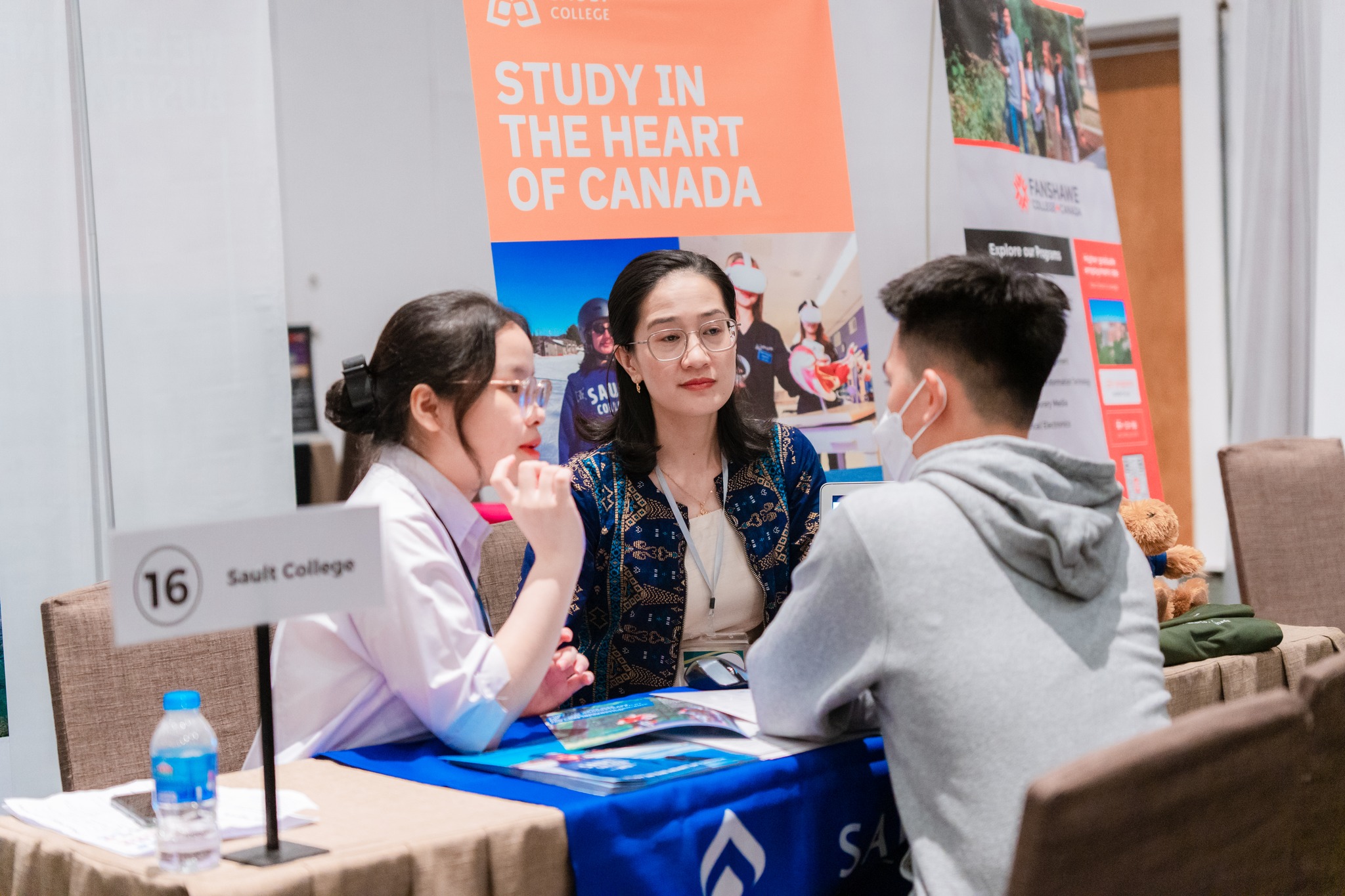 Cô Fairplane và bạn CTV - Đại diện trường Sault College đang tư vấn cho học sinh