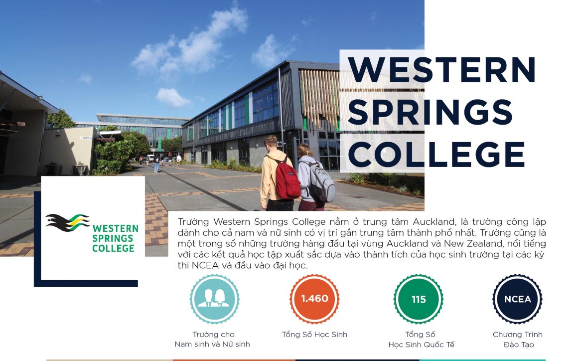 Western Springs College là trường Trung học dành cho học sinh từ lớp 9 đến lớp 13 tọa lạc tại Auckland. Trường đem đến những kiến thức, kỹ năng thực tế giúp học sinh có đủ năng lực để vào một trường đại học, cao đẳng hàng đầu ở New Zealand.